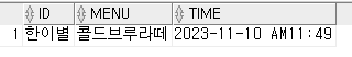 values('한이별','콜드브루라떼','2023-11-10 AM11:49');