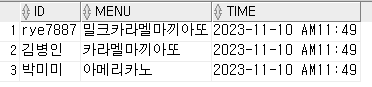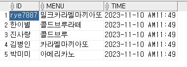 values('박미미','아메리카노','2023-11-10 AM11:49');