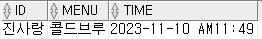 values('진사랑','콜드브루','2023-11-10 AM11:49');