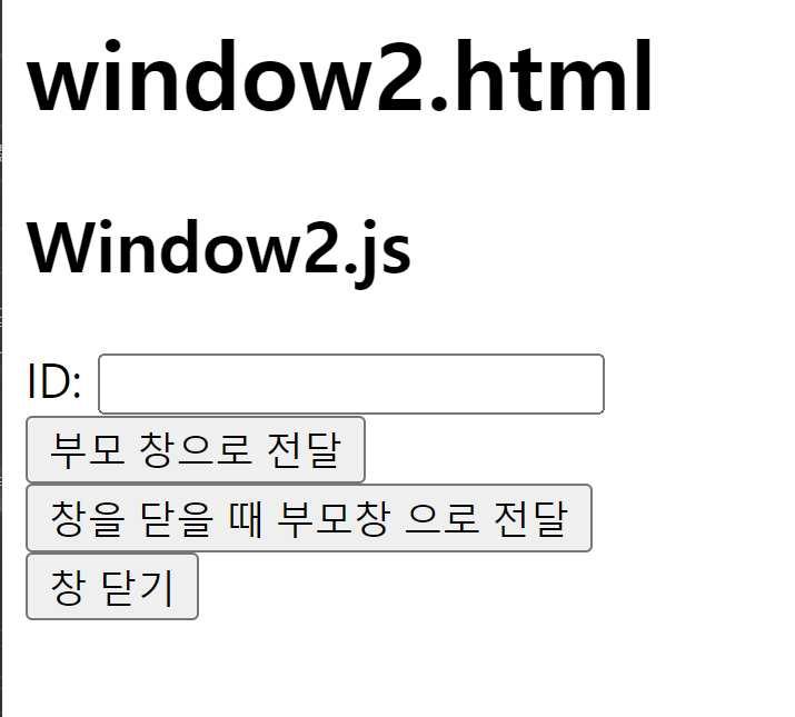 부모창의 html을 작성해보도록하겠습니다. 아래의 html의 특징을 간단하게 서술하고 가볼게요. 저는 html 이름을 "window2.html"으로 그리고 javascript의 이름을 "window2.js"으로 설정했습니다. 그리고 '부모창으로 전달'이라는 버튼을 누르는 메서드는 sendID1()으로, "창을 닫을 때 부모 창으로 전달"이라는 버튼을 누를 때는 sendID2() 메서드로, "창 닫기"라는 것을 누를 때는 onclick="sendID2()" 메서드를 클릭하면 되는 거죠.
