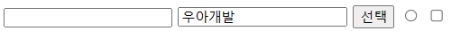 jQuery 실습을 위한 html 코드를 보여드릴게요. html을 이용해서 아래와 같은 창을 일단 만들어볼거에요. input 창 두개, 그리고 "선택"이라는 버튼을 클릭할 수 있는 것과 radio 스타일의 버튼 두개, select문의 내용과 option의 내용이 몯 ㅜ포함되어있죠. 그리고 마지막에는 fieldset 코드가 함께 있습니다.