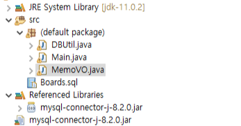 저는 실습예제로도 사용할 새로운 클래스를 세 가지를 먼저 만들고 시작할텐데요. DBUtil Class, Main Class, MemoVO Class로 나누고, DBUtil Class에서는 MySQL과 연결할 Connection과 Method 등을 작성할 것이고, Main Class에서는 실행을 위한 모든 코드들을 정렬할 것입니다. 마지막으로 MemoVO에서는 MySQL에 정의했던 요소들을 정리할 것입니다.